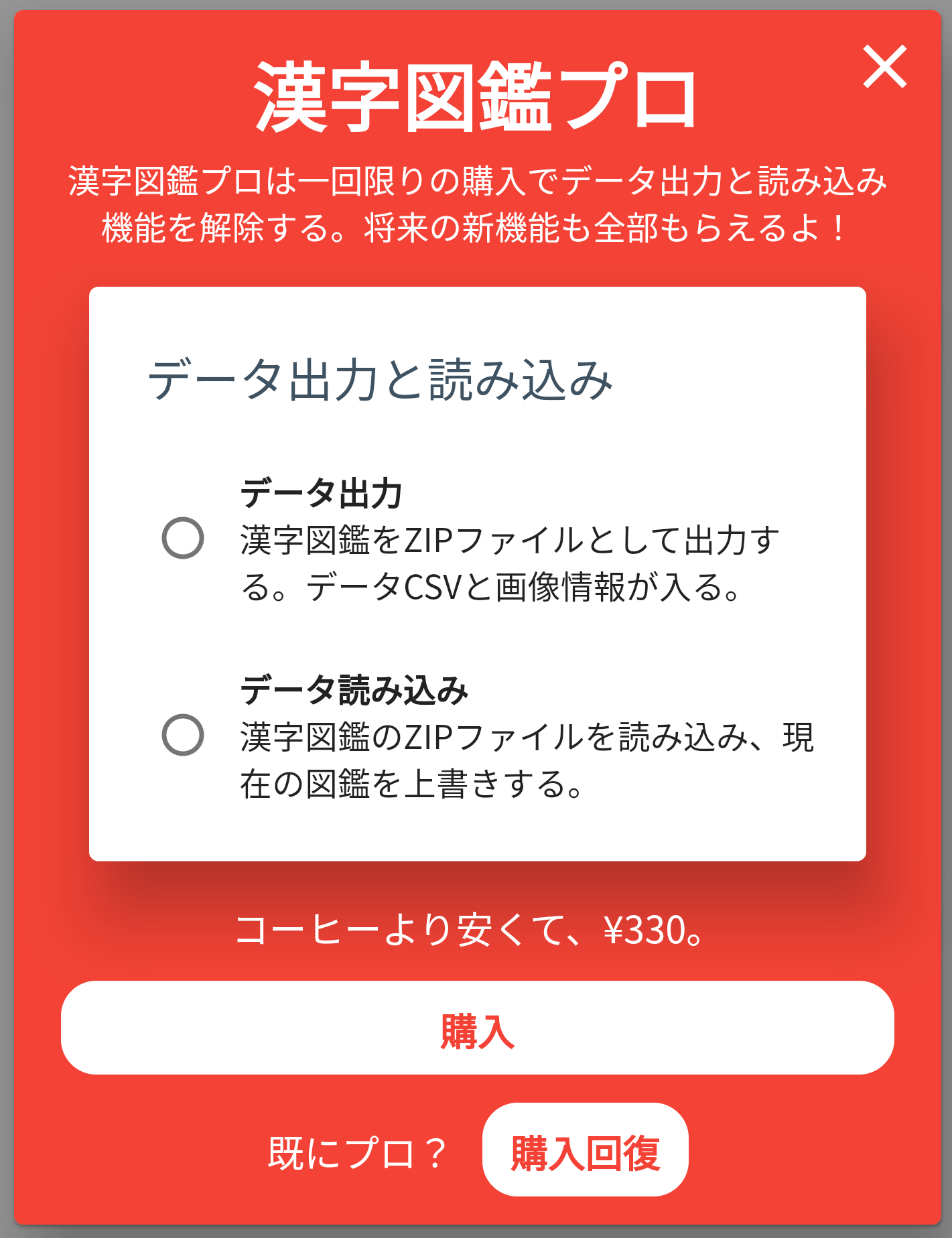 代わりに、初めてアプリ内購入を入れることにしました。データ出力/読み込み機能を実装して、「漢字図鑑プロ」で鍵をかけました。